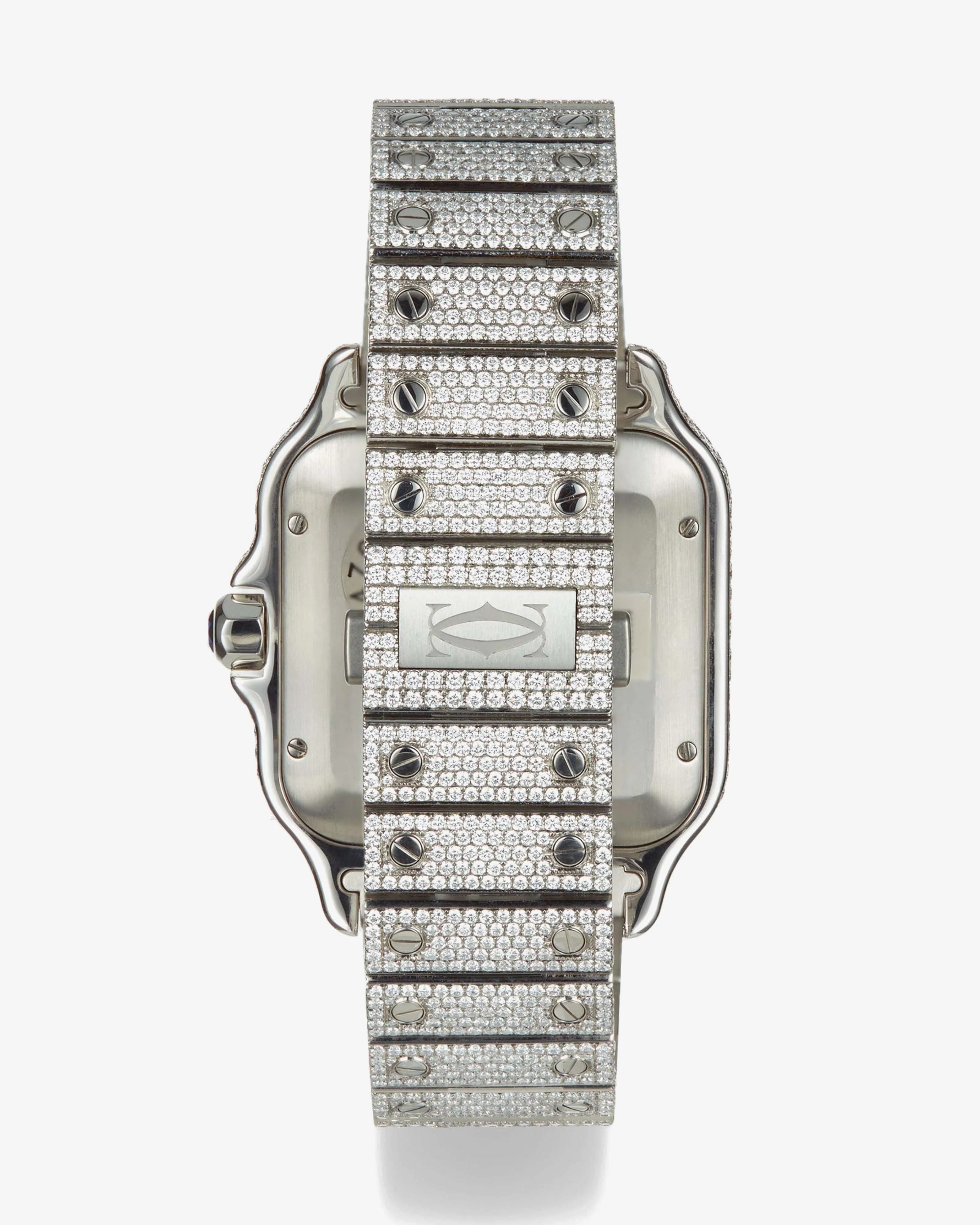As part of the Reflekt range, this Customised Cartier Santos De Cartier is totally encrusted in white diamonds with a blue face, and sapphire crown